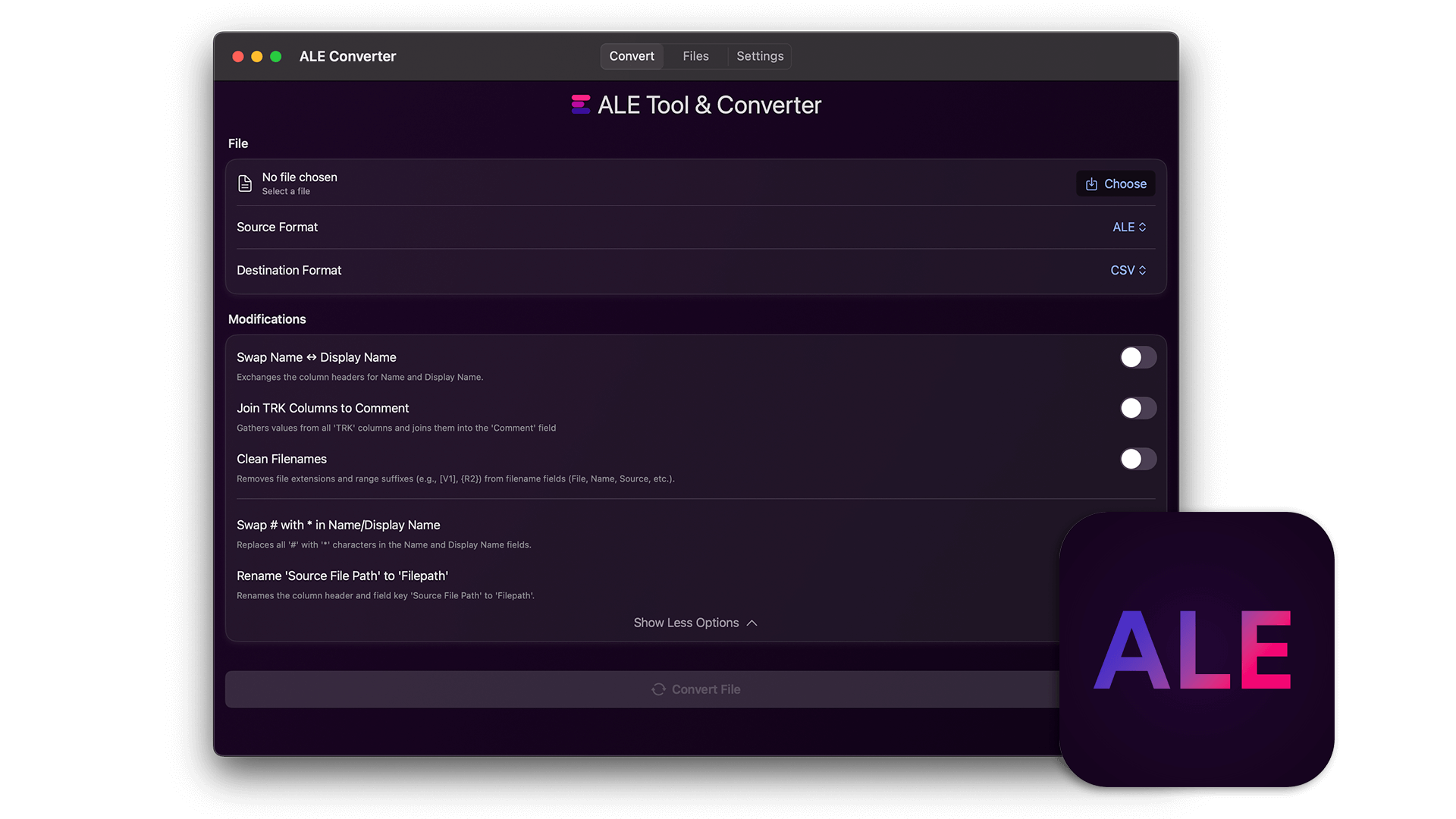 The EditingTools.io ALE Tool & Converter helps with converting and modifying .ale files.
