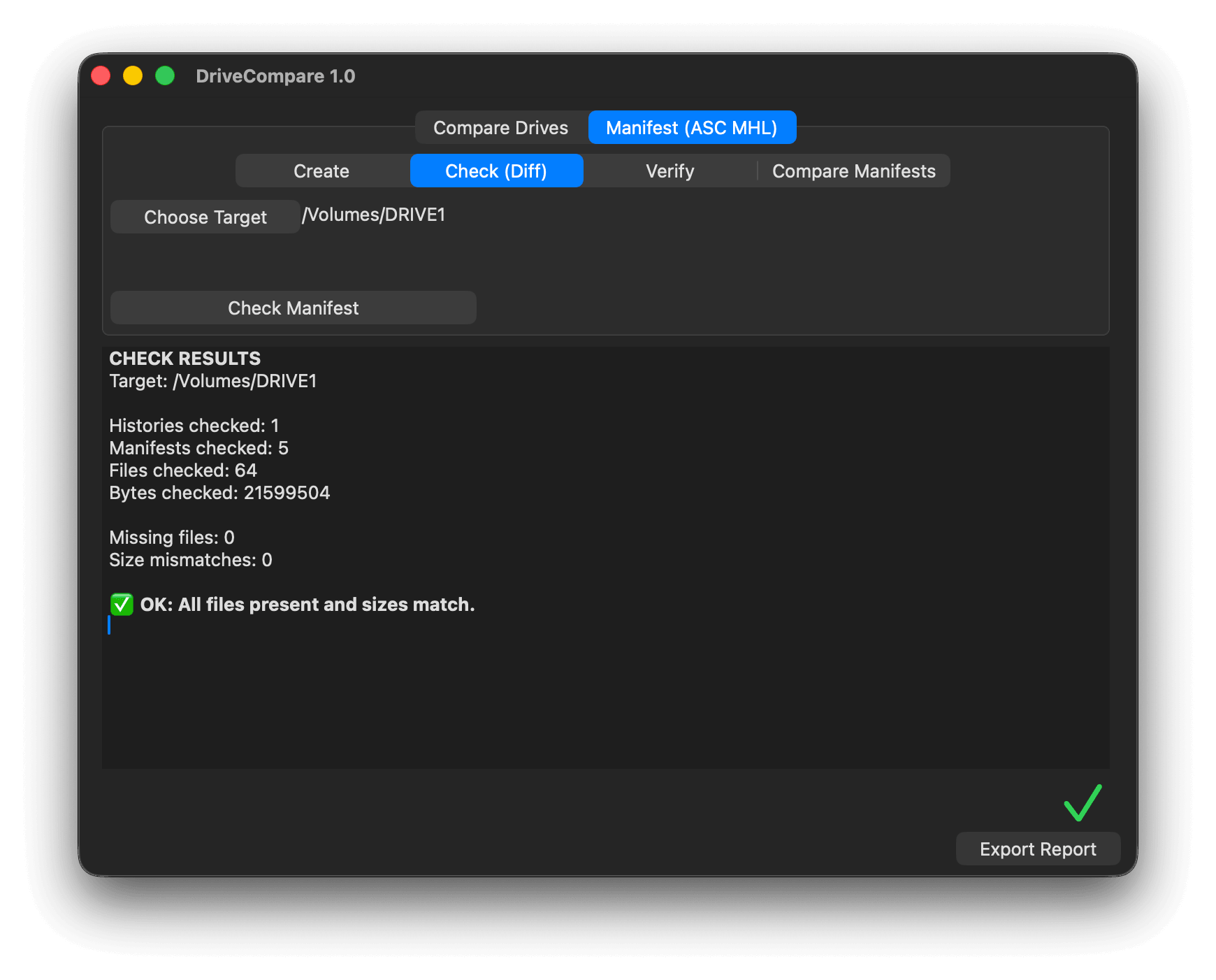 Check (Diff) – Compares the selected folder contents against an ASC MHL manifest using file names and sizes to quickly identify differences.