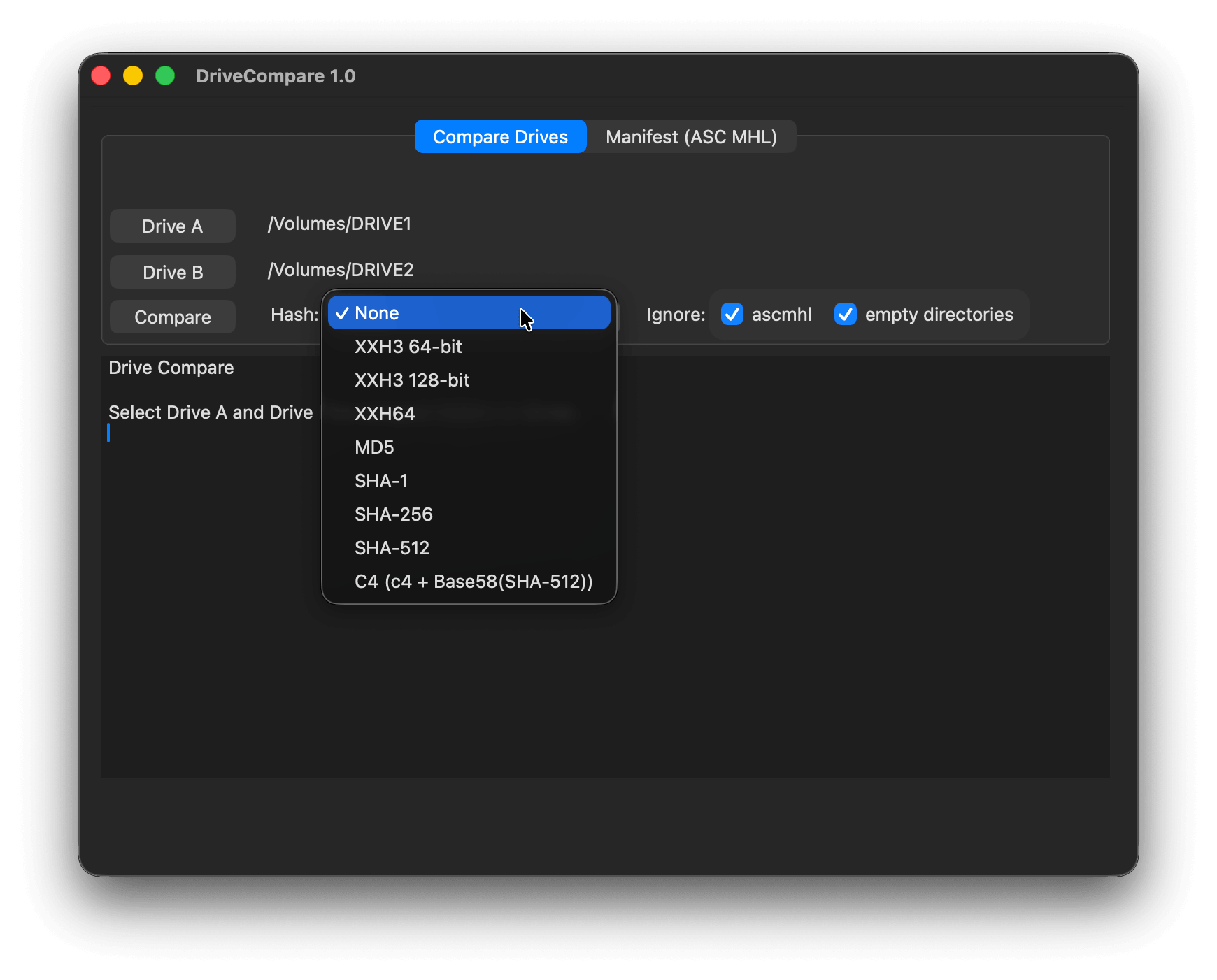 Select which 2 drives or directories you want to compare and choose the hash type. If None is selected it will only compare names and file sizes, but not check that the files are exactly the same. You can ignore ASC MHL directories and empty directories.