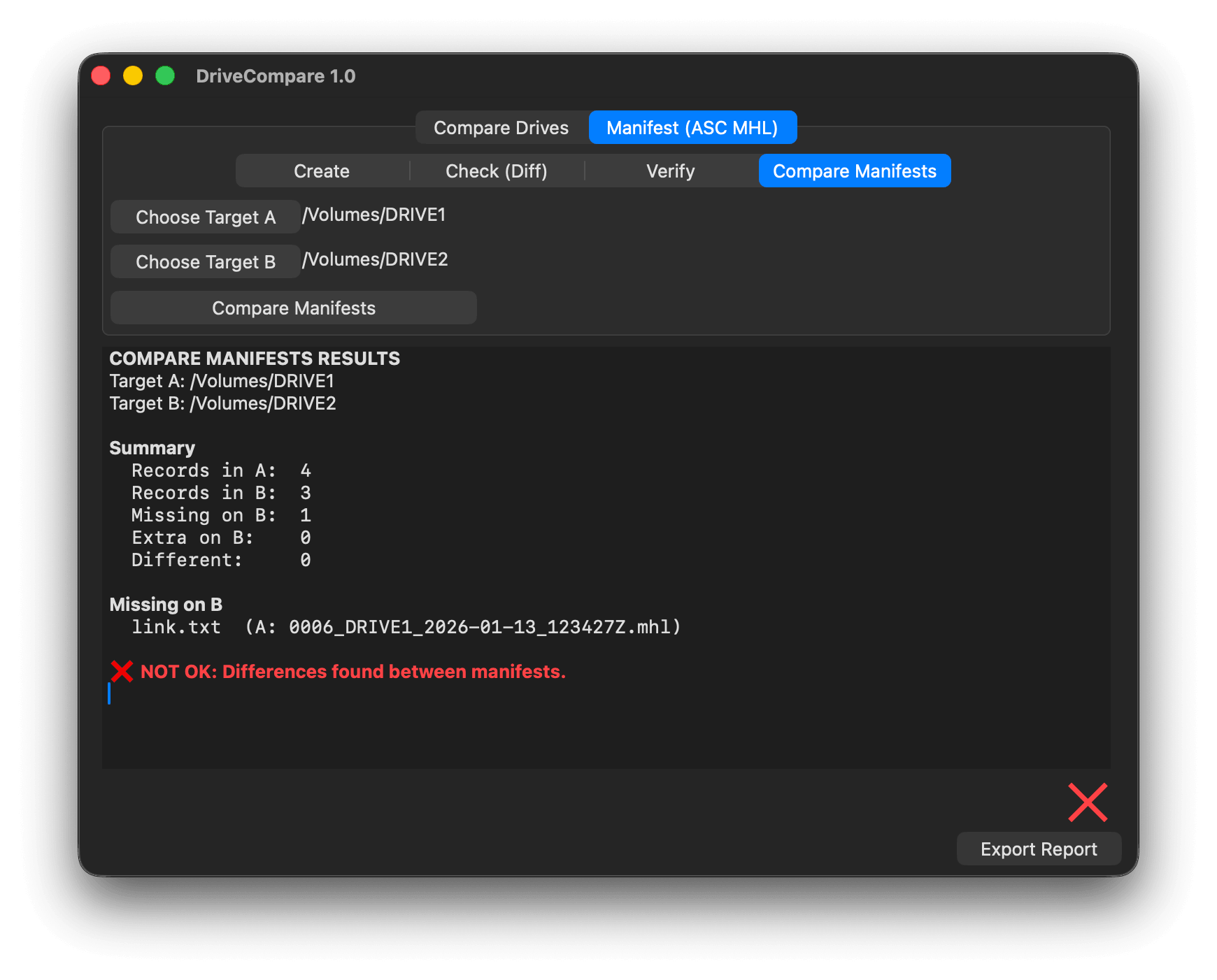 Compare two ASC MHL manifests to identify differences in file structure, metadata, or content. This method is not part of the ASC MHL standard and relies on the accuracy of the manifests themselves — useful for cross-referencing archives or backup sets.